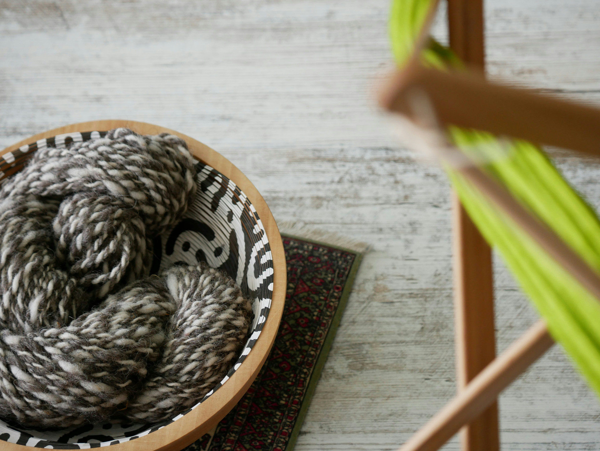 Garnbollen er laget av indisk rosentre, som gir den et holdbart og naturlig utseende. Treets struktur og nyanser gjør hver bolle unik, og materialet er tungt nok til å stå stødig på bordet under bruk.